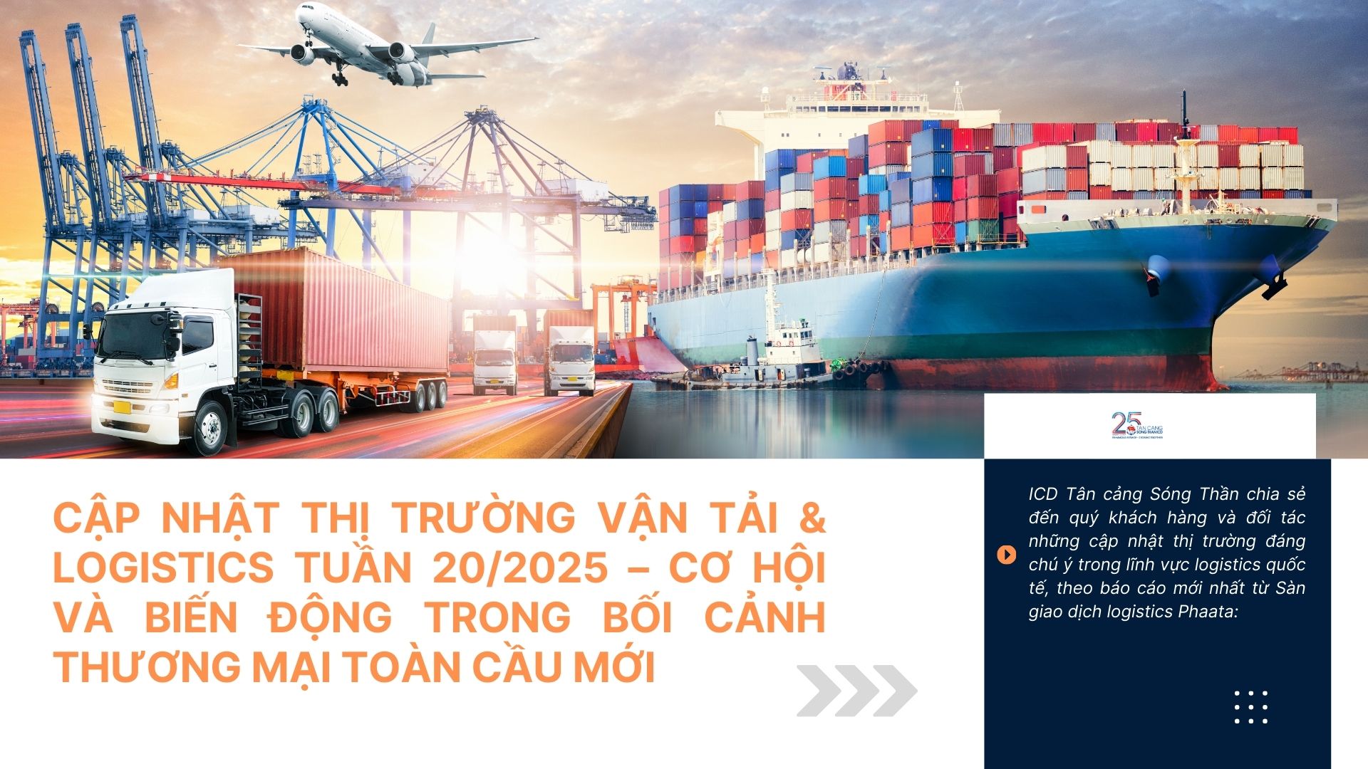 ICD Tân cảng Sóng Thần chia sẻ đến quý khách hàng và đối tác những cập nhật thị trường đáng chú ý trong lĩnh vực logistics quốc tế, theo báo cáo mới nhất từ Sàn giao dịch logistics Phaata